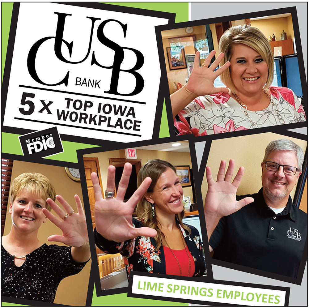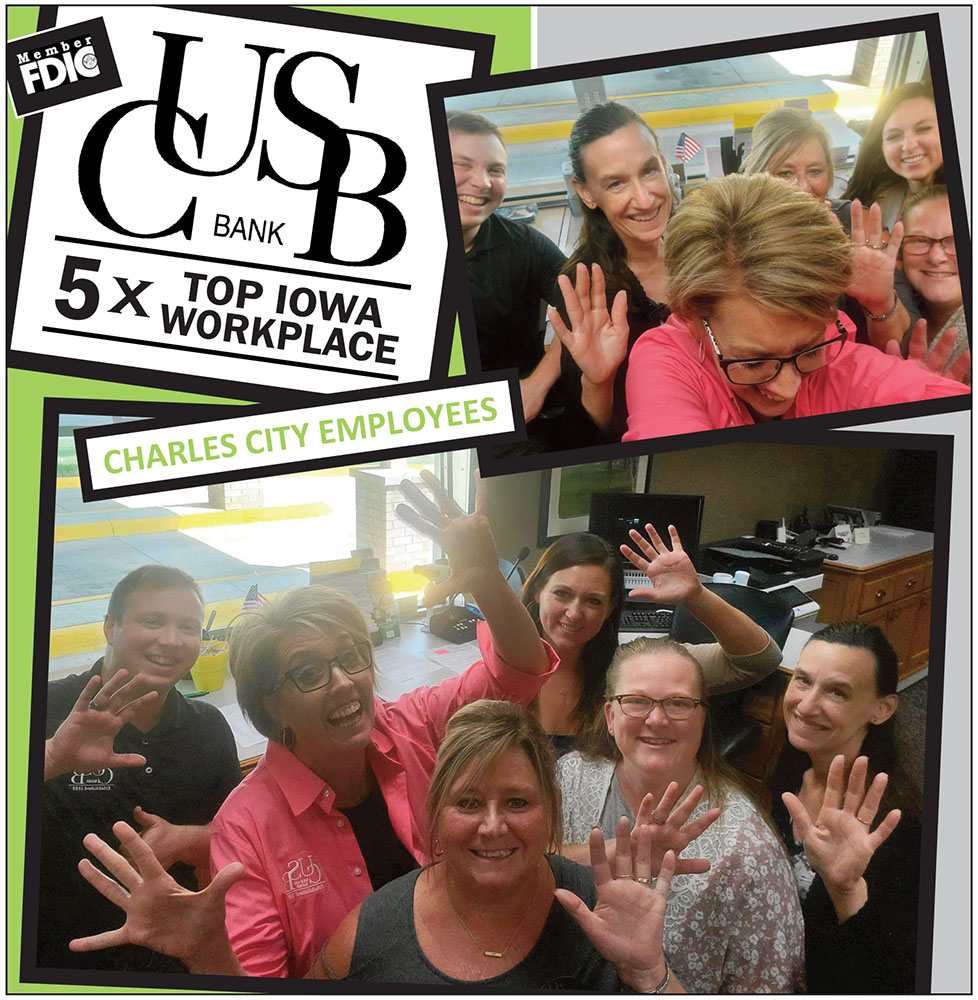 CUSB Bank’s employees completed a survey that asked them about the direction of the bank, work conditions, career development, execution, managers, pay, and benefits. CUSB Bank has 87 employees across their five locations in Cresco, Ridgeway, Lime Springs, Osage, and Charles City.