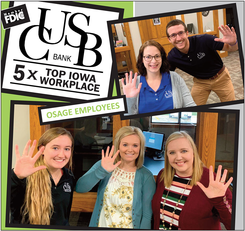 Thomson said, “We are proud to be named a Top Workplace in the state of Iowa by our employees. CUSB Bank was established 132 years ago on strong values and ethics and we have hired people that have the same values. We are proud of our employees and know that a bank is a bank is a bank, however, the people inside are what makes a difference.”