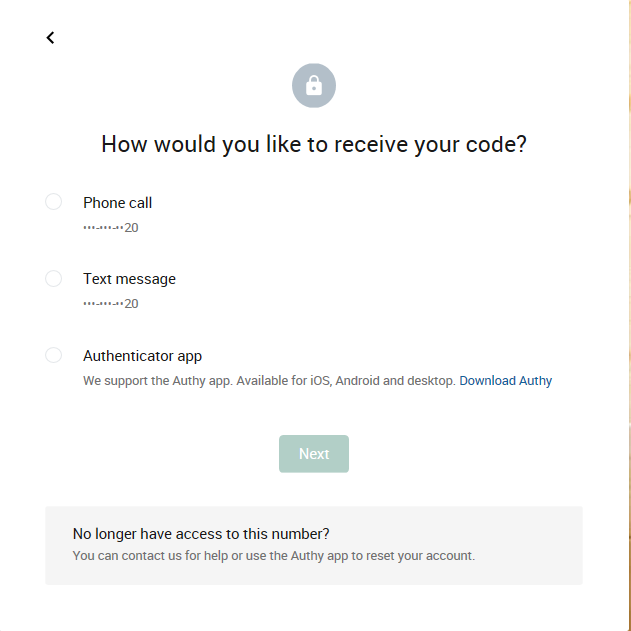 For your safety, we have added an enhanced security feature for our E-Banking service called two-factor authentication. When you log in for the first time, you will enter your email address and mobile phone number. You will determine how you'll receive your security code with the screen below. A code will be sent to you that you will enter when logging in.